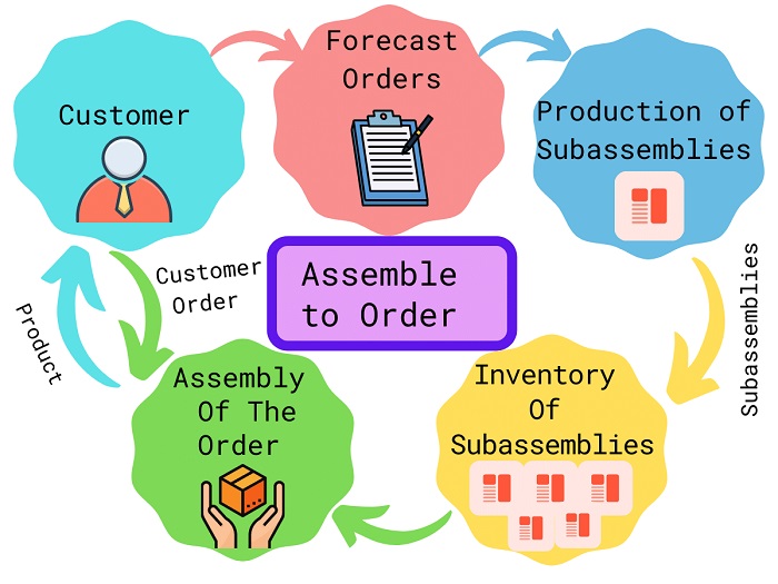 Với phương thức sản xuất ATO – Lắp ráp theo đơn hàng thì có đặc trưng yêu cầu các cấu thành sản phẩm phải được sản xuất sẵn nhưng chưa được lắp ráp. Sau khi nhận được đơn đạt hàng thì các bộ phận đó sẽ được nhanh chóng lắp ráp và gửi đến khách hàng.